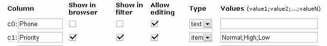 How to add a custom field using Layout DesignerAdding a custom field using Layout Designer (version 2.22 or newer) does not require editing the newticket.html template at all. Just define a custom field using System Setup form (setup.cgi) and watch the custom field instantly available. The following procedure will add 2 custom fields - Phone and Priority. Step 1. Login to System Setup form (setup.cgi), scroll down to Layout Designer section and define two fields as shown below.