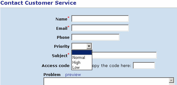 How the magic happens? If you open the newticket.html template you will notice the (%CUSTOMVARS%) macro. When generating a contact form page the Trouble Ticket Express reads custom field definitions and builds html code for each custom field as a two columns row. For each custom field it fills left colum with the field's label and the right one - with the form input formatted according to the field's type. The (%CUSTOMVARS%) macro is replaced with the resulting html code. But what if you need more control over custom fields appearance? For example you may want the Priority to be a hidden field and default to Normal. Here is how: Step 1. Edit newticket.html template. Replace the (%CUSTOMVARS%) macro with the following code (%CUSTOMROW0%) <input type="hidden" name="xPriority" value="Normal"> (%CUSTOMROW2%) (%CUSTOMROW3%) (%CUSTOMROW4%) (%CUSTOMROW5%) (%CUSTOMROW6%) (%CUSTOMROW7%) (%CUSTOMROW8%) (%CUSTOMROW9%) Step 2. Watch the result. Navigate to the contact form (ttx.cgi). Here is what you should see: